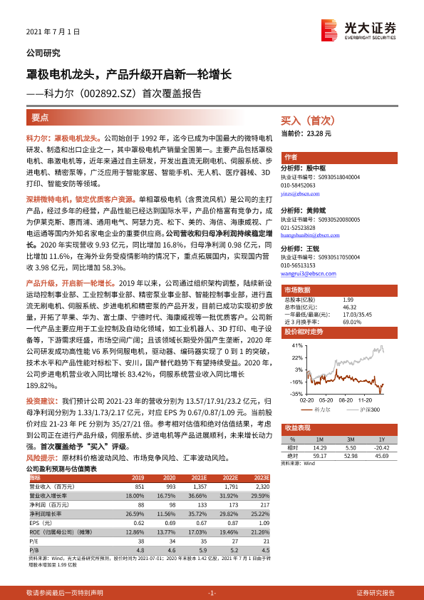 【光大证券】【20210701】科力尔(002892.SZ)首次覆盖报告:罩极电机龙头,产品升级开启新一轮增长-23页