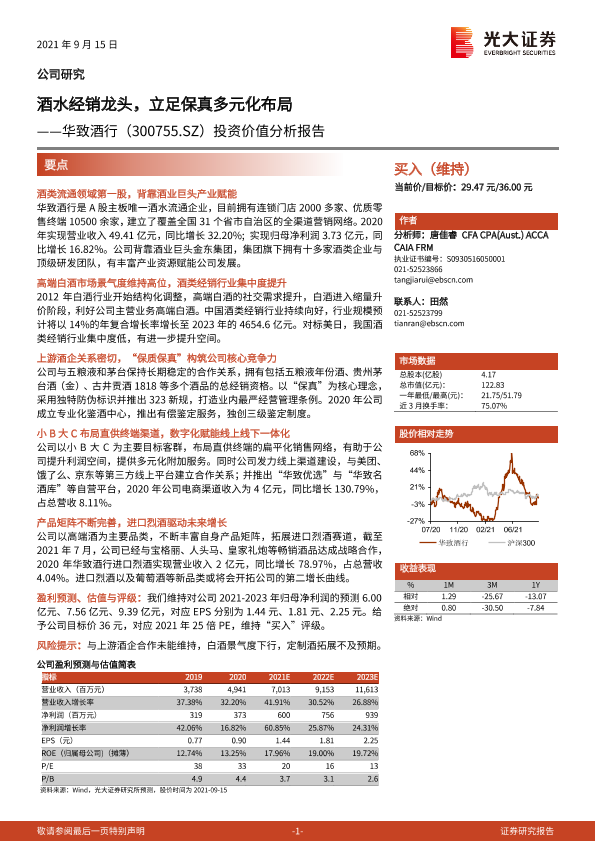 【光大证券】【20210915】20210915-光大证券-华致酒行-300755.SZ-投资价值分析报告:酒水经销龙头,立足保真多元化布局-34页