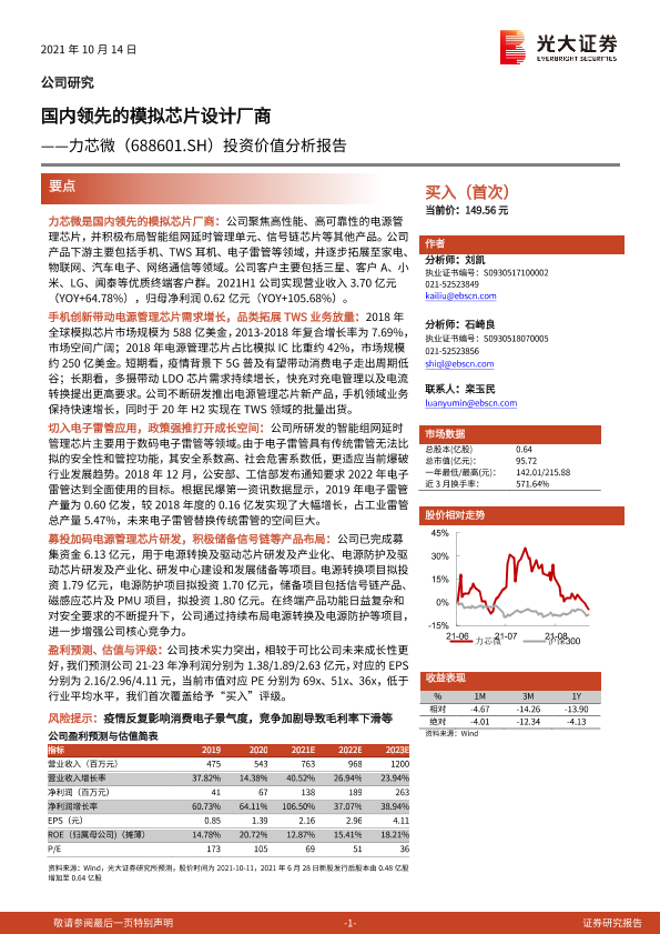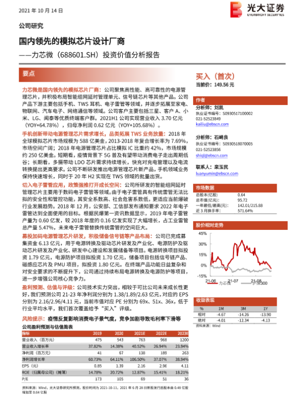 【光大证券】【20211014】20211014-光大证券-力芯微-688601.SH-投资价值分析报告:国内领先的模拟芯片设计厂商-32页
