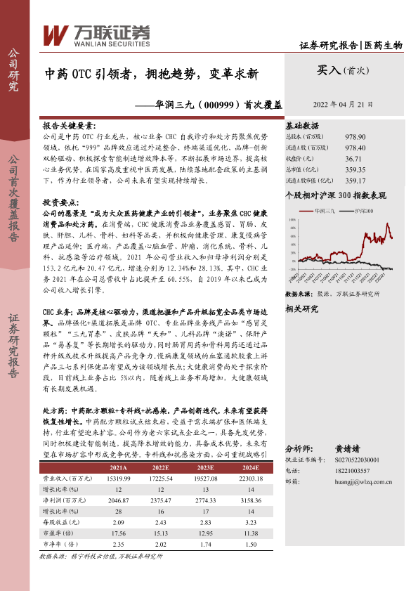买入评级 中药OTC 首次覆盖 华润三九 医药生物
