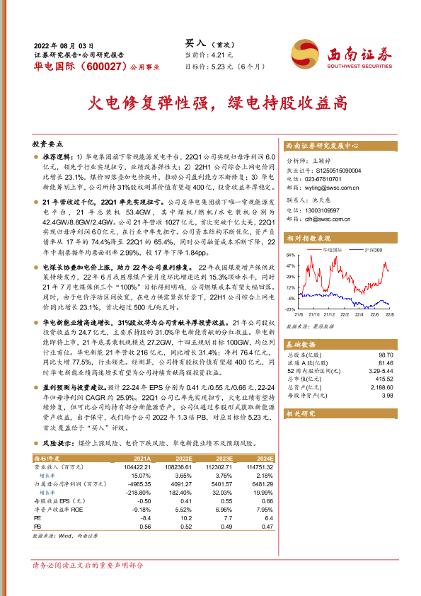 【西南证券】【20220803】20220803-西南证券-华电国际-600027.SH-火电修复弹性强,绿电持股收益高-23页