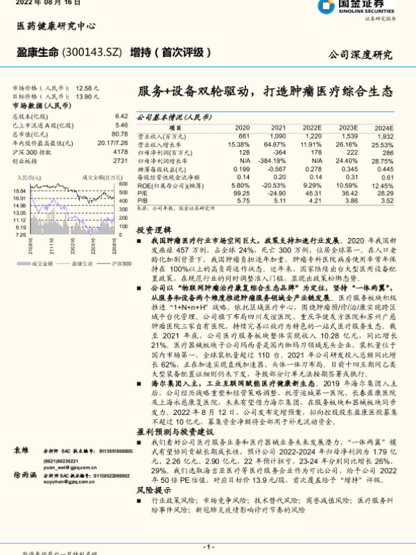 医疗服务 行业分析 盈康生命 医疗器械 肿瘤治疗
