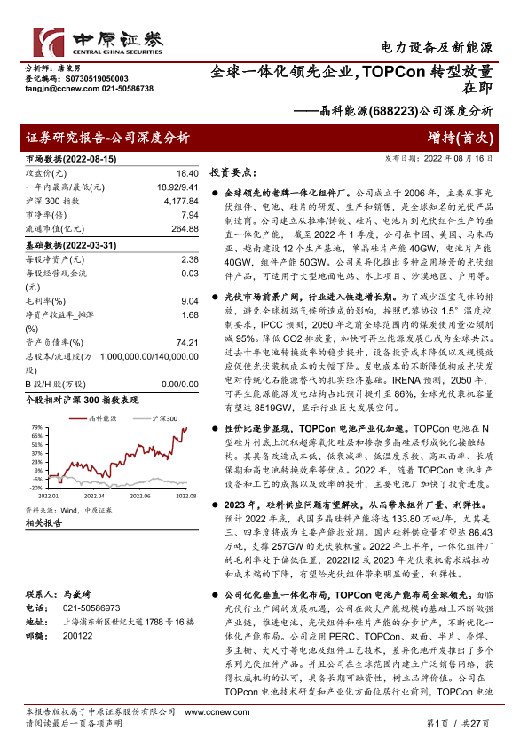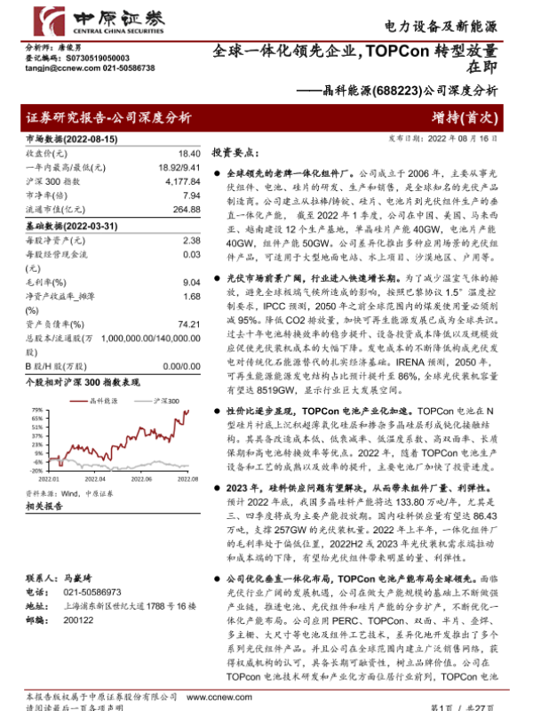 【中原证券】【20220816】全球一体化领先企业,TOPCon转型放量在即——晶科能源(688223)公司深度分析-27页