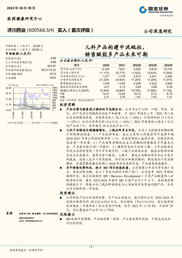 【国金证券】【20220905】济川药业-600566.SH-儿科产品构建中流砥柱,销售赋能多产品未来可期-21页