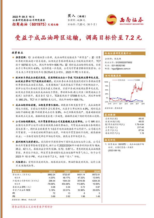 【西南证券】【20220916】招商南油-601975.SH-受益于成品油跨区运输,调高目标价至7.2元-26页