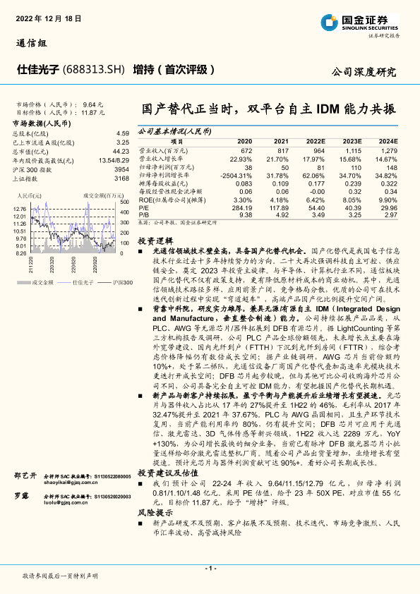 国产替代 光通信 DFB激光器 IDM能力 PLC光分路器