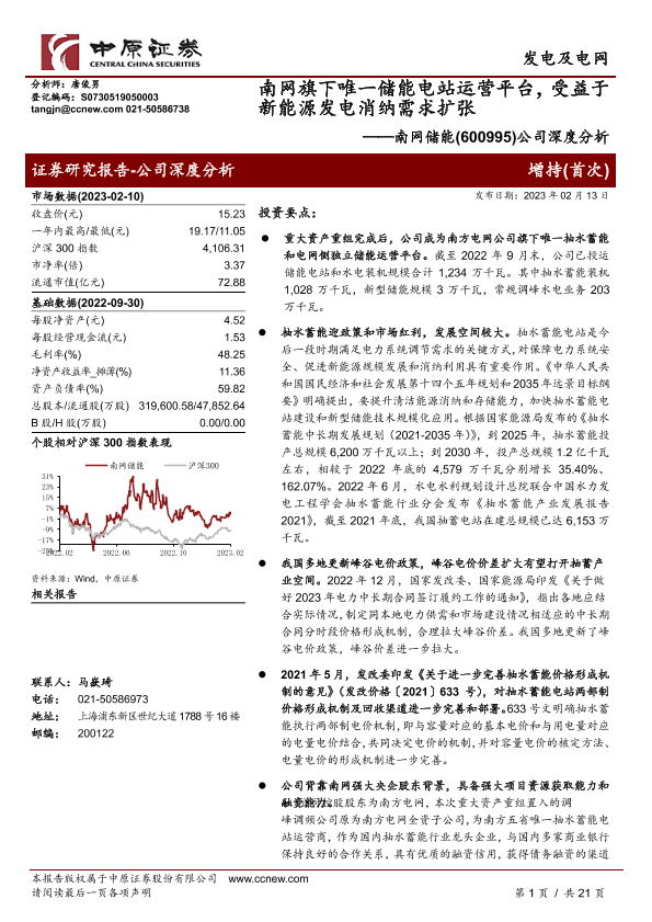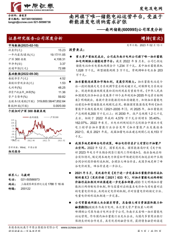 【中原证券】【20230213】南网储能-600995.SH-公司深度分析:南网旗下唯一储能电站运营平台,受益于新能源发电消纳需求扩张-21页