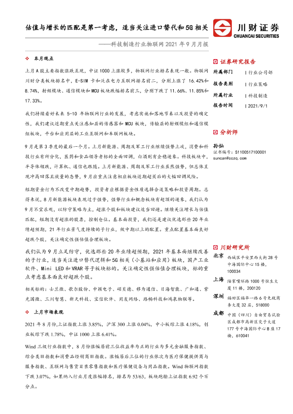 【川财证券】【20210901】科技制造行业物联网2021年9月月报:估值与增长的匹配是第一考虑,适当关注进口替代和5G相关-17页