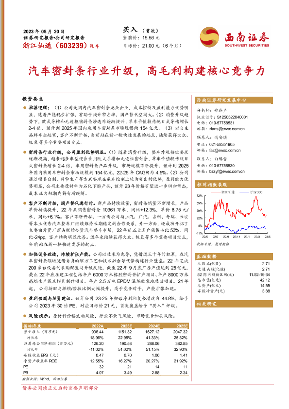 【西南证券】【20230520】浙江仙通-603239.SH-汽车密封条行业升级,高毛利构建核心竞争力-26页
