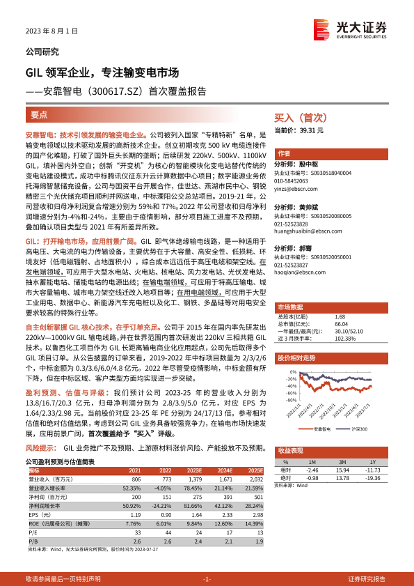 【光大证券】【20230801】20230801-光大证券-安靠智电-300617.SZ-首次覆盖报告:GIL领军企业,专注输变电市场-21页
