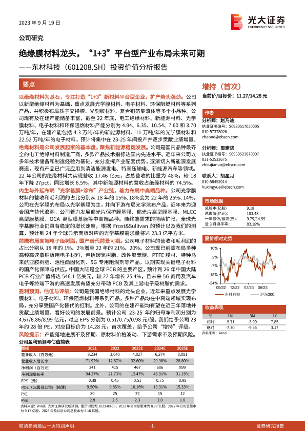 【光大证券】【20230919】20230919-光大证券-东材科技-601208.SH-投资价值分析报告:绝缘膜材料龙头,“1+3”平台型产业布局未来可期-59页