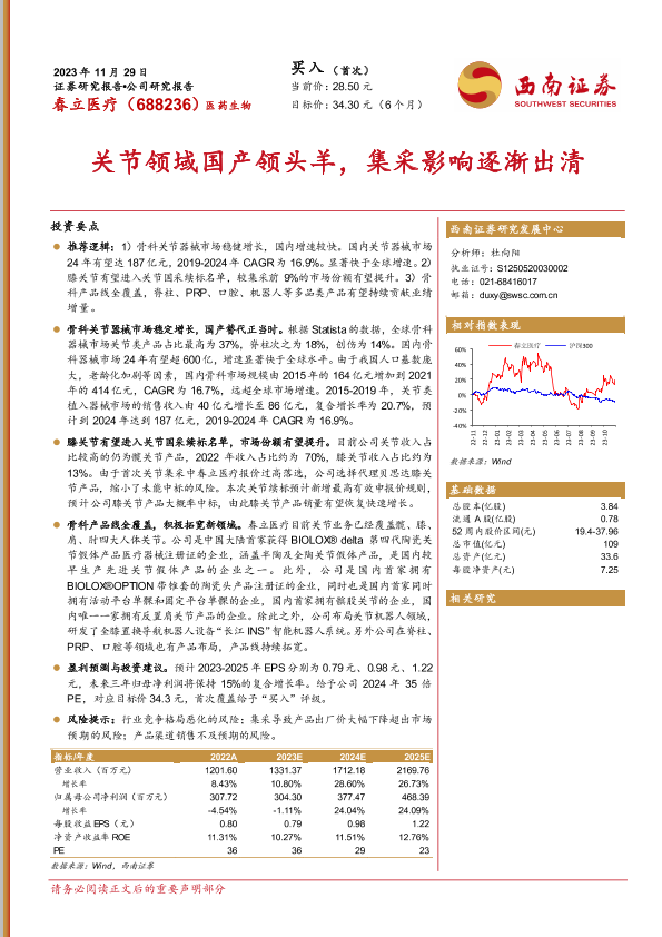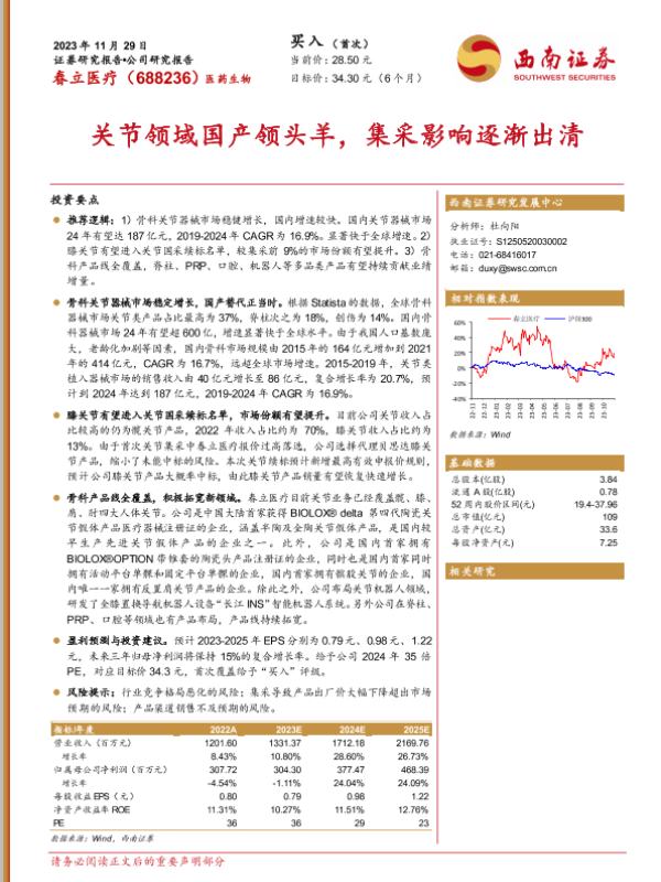 【西南证券】【20231129】春立医疗-688236.SH-关节领域国产领头羊,集采影响逐渐出清-38页