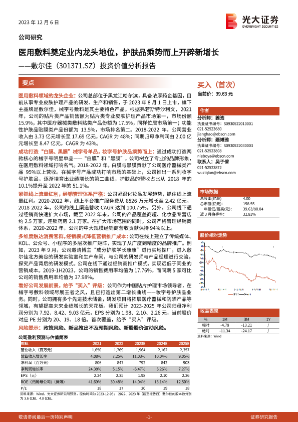 【光大证券】【20231206】20231206-光大证券-敷尔佳-301371.SZ-投资价值分析报告:医用敷料奠定业内龙头地位,护肤品乘势而上开辟新增长-29页