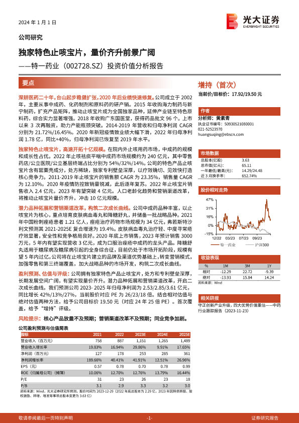 【光大证券】【20240101】独家特色止咳宝片,量价齐升前景广阔——特一药业(002728.SZ)投资价值分析报告-30页
