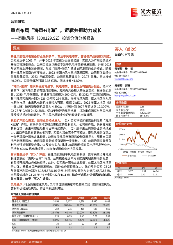 【光大证券】【20240104】泰胜风能(300129.SZ)投资价值分析报告:重点布局“海风+出海”,逻辑共振助力成长-38页