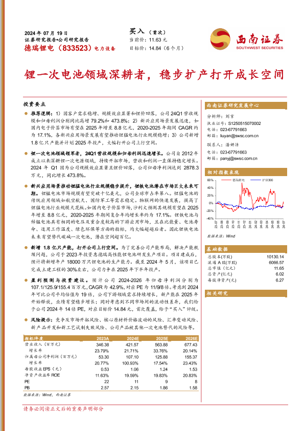 锂一次电池 德瑞锂电 扩产计划 盈利预测 市场分析