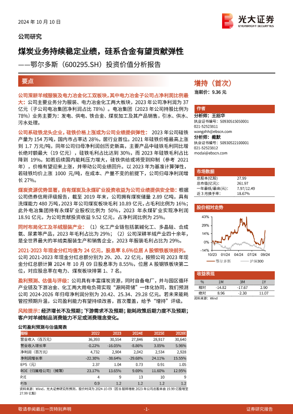 【光大证券】【20241010】20241010-光大证券-鄂尔多斯-600295.SH-投资价值分析报告:煤炭业务持续稳定业绩,硅系合金有望贡献弹性-27页