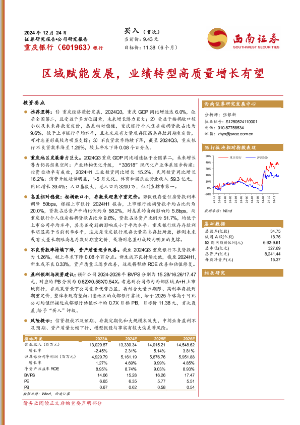 区域发展 重庆银行 银行股分析 息差分析 不良贷款