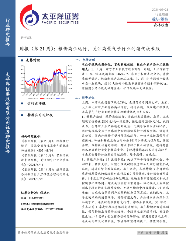 【太平洋证券】【20210523】20210523-太平洋-农林牧渔周报(第21周):粮价高位运行,关注高景气子行业的绩优成长股-15页