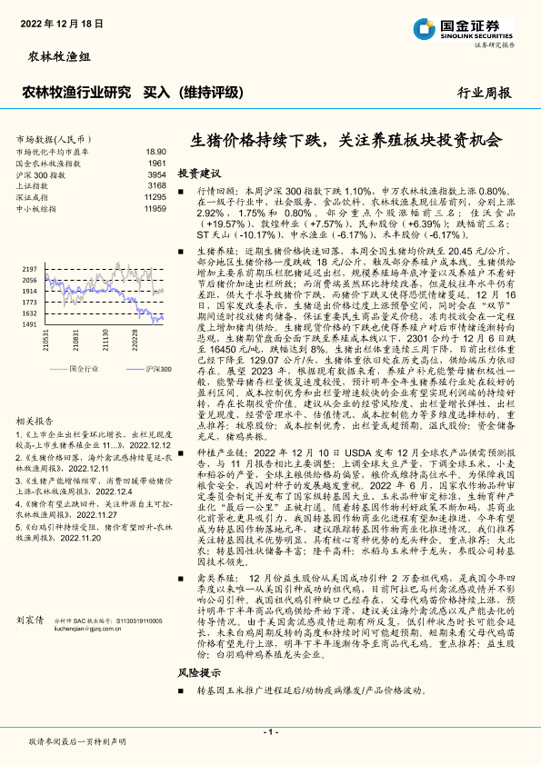 【国金证券】【20221218】20221218-国金证券-农林牧渔行业研究:生猪价格持续下跌,关注养殖板块投资机会-17页