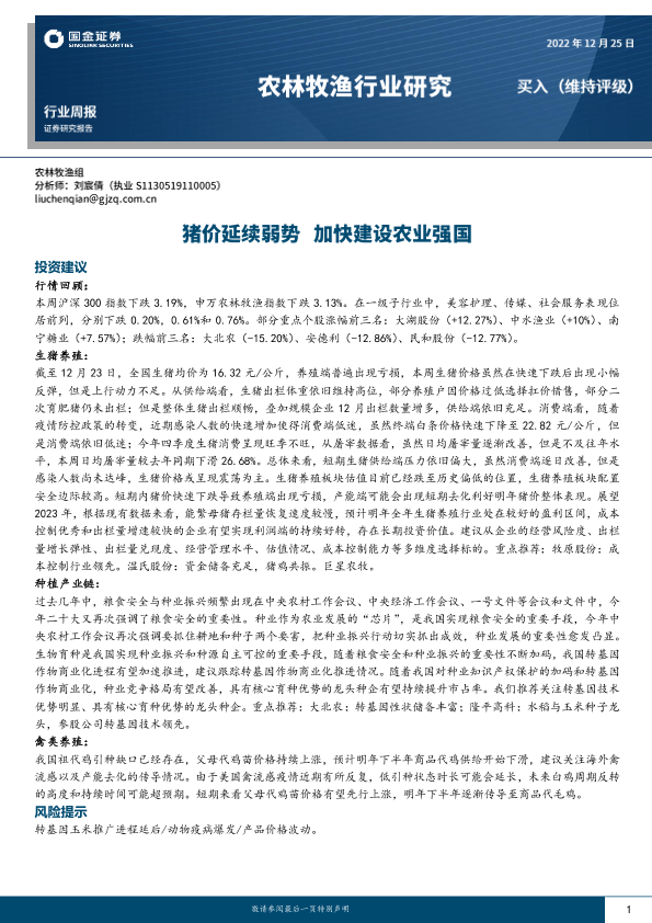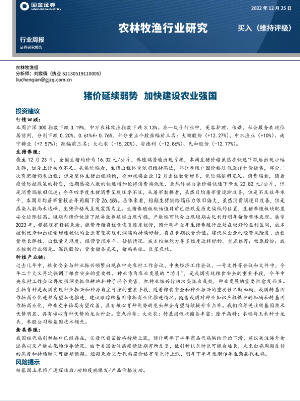 【国金证券】【20221225】20221225-国金证券-农林牧渔行业研究:猪价延续弱势,加快建设农业强国-15页
