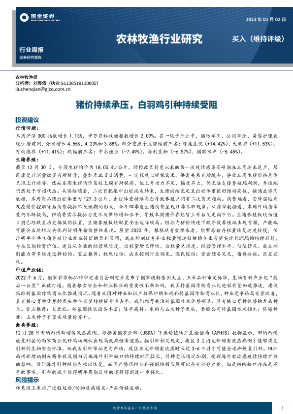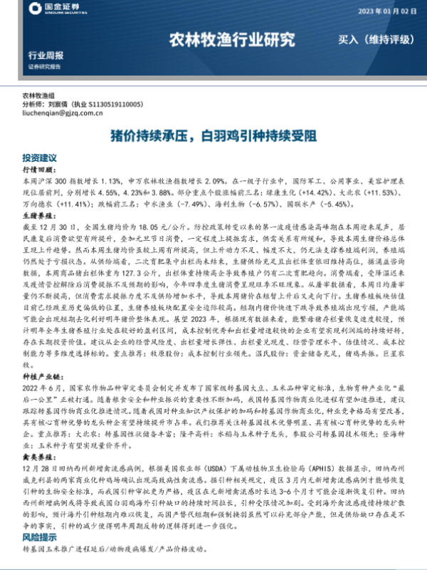 【国金证券】【20230102】20230102-国金证券-农林牧渔行业研究:猪价持续承压,白羽鸡引种持续受阻-15页