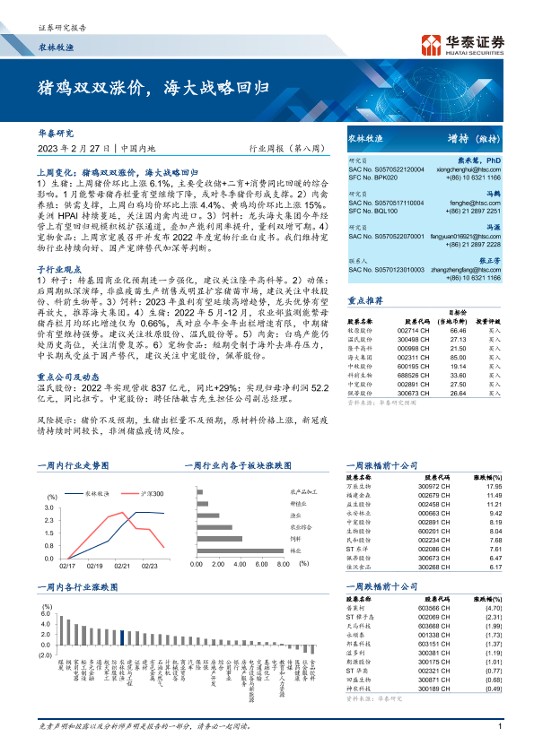 【华泰证券】【20230227】20230227-华泰证券-农林牧渔行业周报(第八周):猪鸡双双涨价,海大战略回归-22页