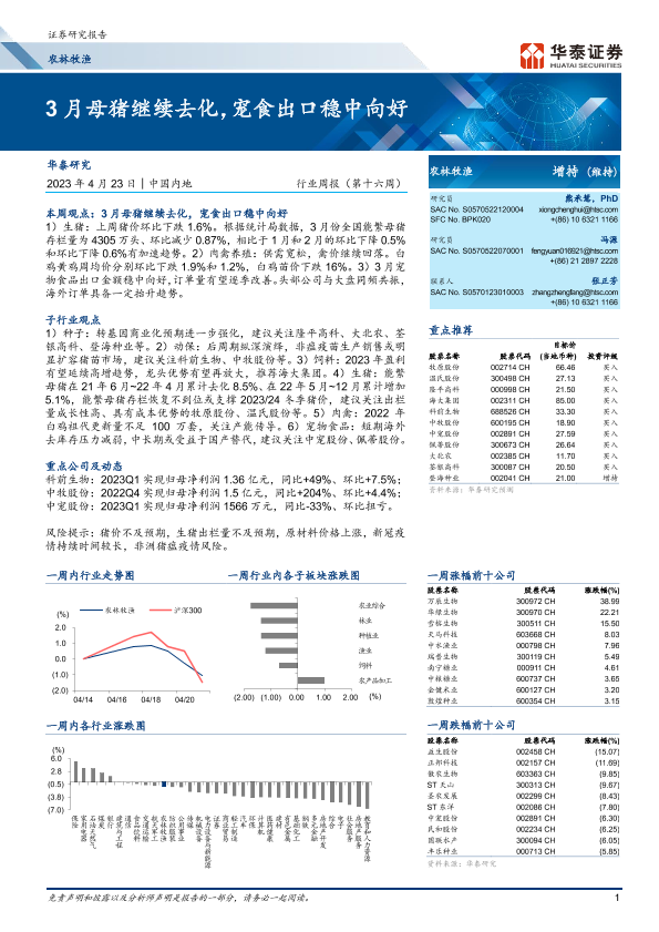 【华泰证券】【20230423】20230423-华泰证券-农林牧渔行业周报(第十六周):3月母猪继续去化,宠食出口稳中向好-30页