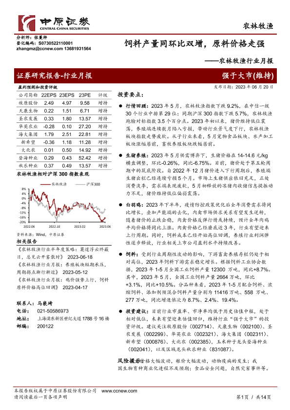 【中原证券】【20230620】20230620-中原证券-农林牧渔行业月报:饲料产量同环比双增,原料价格走强-14页