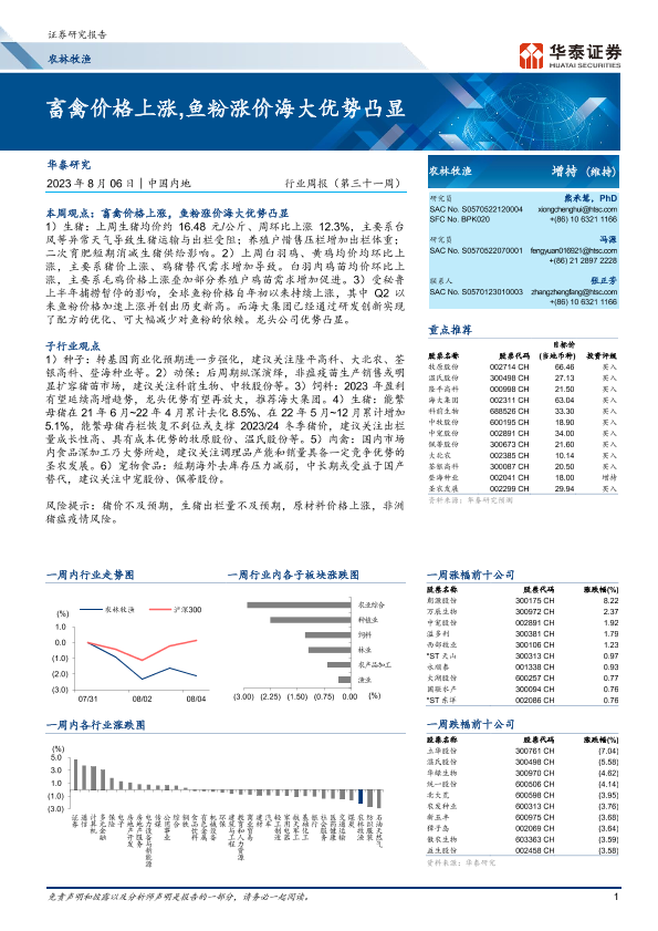 【华泰证券】【20230806】20230806-华泰证券-农林牧渔行业周报(第三十一周):畜禽价格上涨,鱼粉涨价海大优势凸显-25页