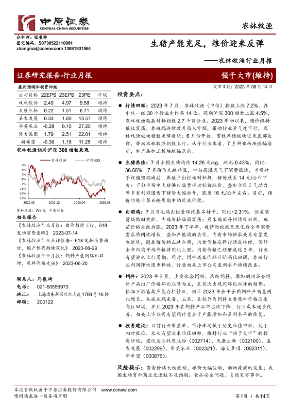 【中原证券】【20230814】20230814-中原证券-农林牧渔行业月报:生猪产能充足,粮价迎来反弹-14页