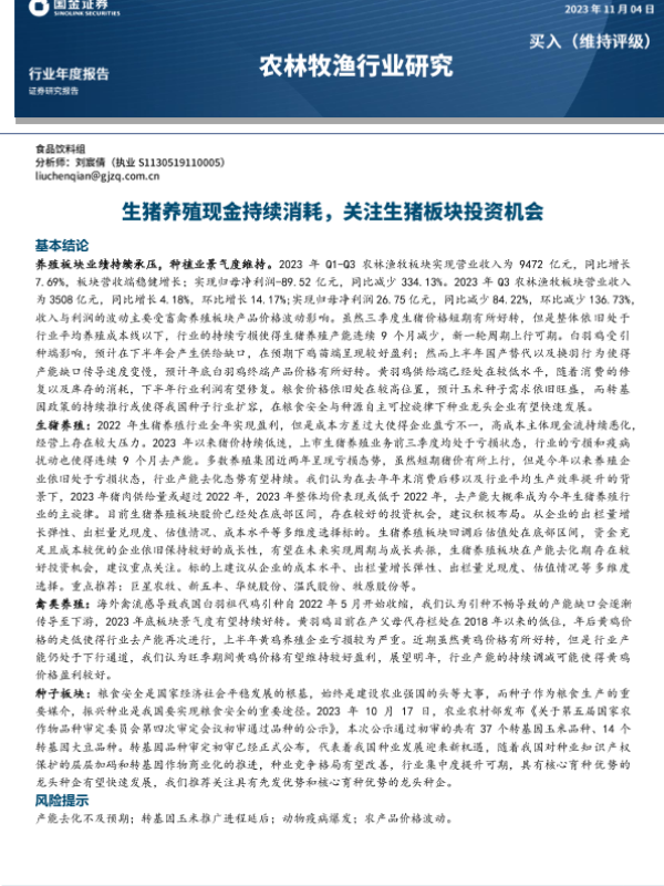 【国金证券】【20231104】农林牧渔行业研究:生猪养殖现金持续消耗,关注生猪板块投资机会-17页