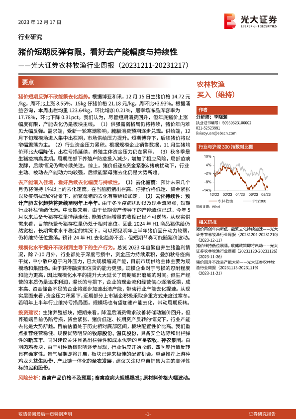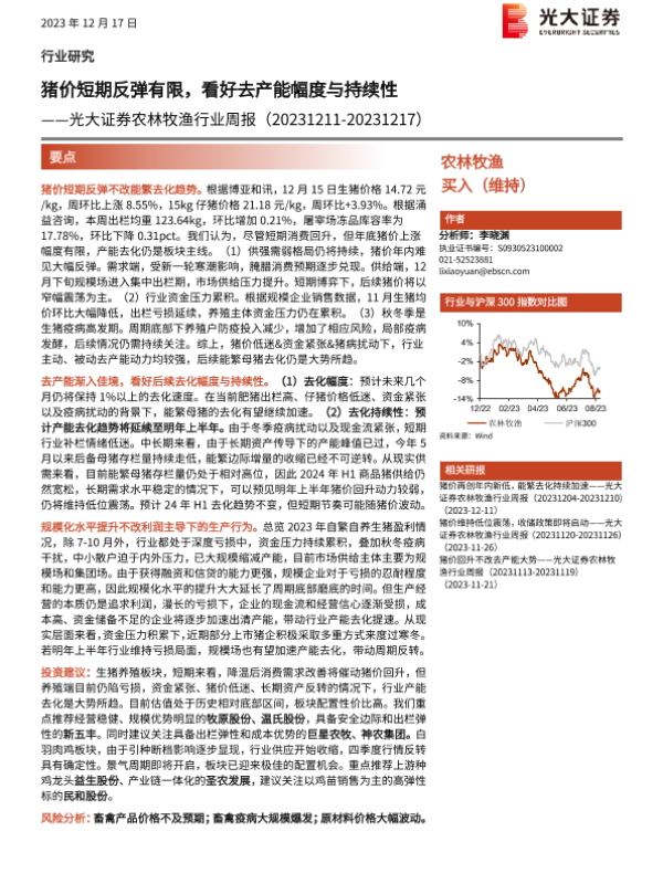 【光大证券】【20231217】20231217-光大证券-农林牧渔行业周报:猪价短期反弹有限,看好去产能幅度与持续性-14页