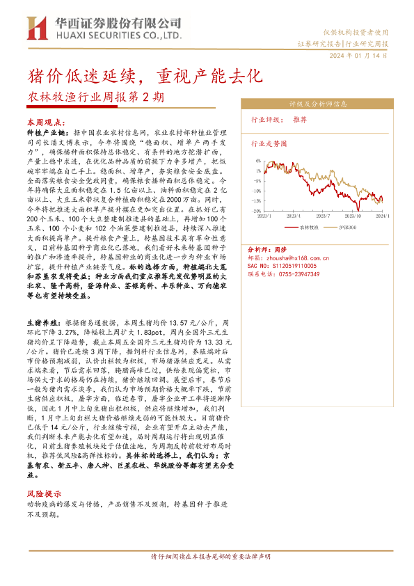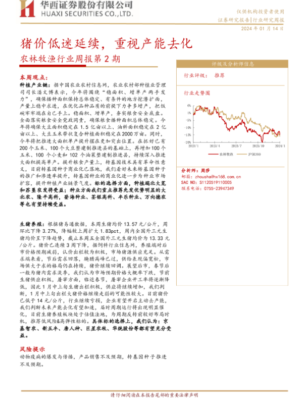 【华西证券】【20240114】20240114-华西证券-农林牧渔行业周报第2期:猪价低迷延续,重视产能去化-25页