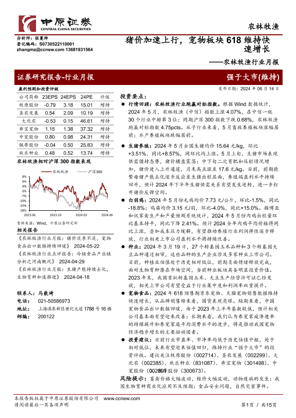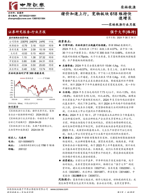 【中原证券】【20240614】20240614-中原证券-农林牧渔行业月报:猪价加速上行,宠物板块618维持快速增长-15页