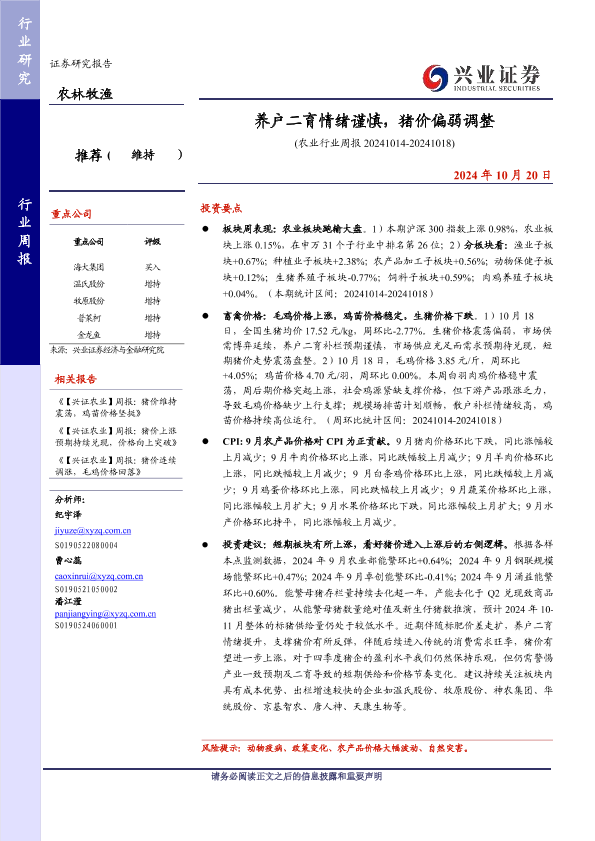 【兴业证券】【20241020】养户二育情绪谨慎,猪价偏弱调整-17页