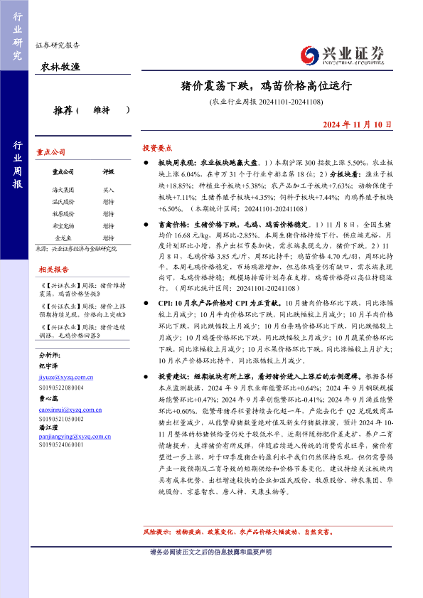 【兴业证券】【20241110】20241110-兴业证券-农林牧渔行业周报:猪价震荡下跌,鸡苗价格高位运行-17页