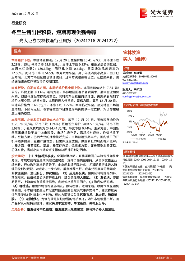 【光大证券】【20241222】20241222-光大证券-农林牧渔行业周报:冬至生猪出栏积极,短期再现供强需弱-12页