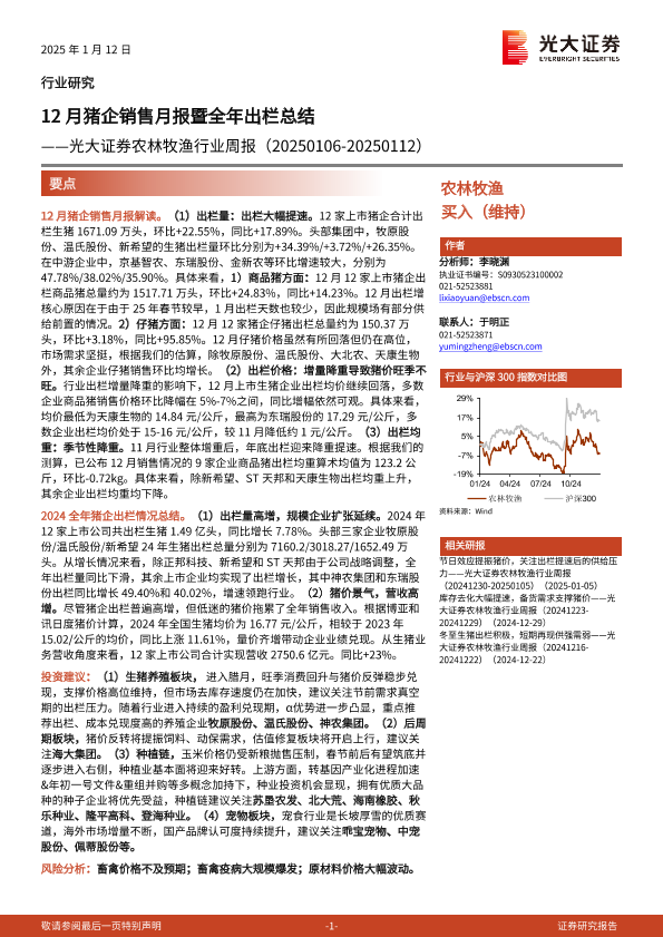 【光大证券】【20250112】20250112-光大证券-农林牧渔行业周报:12月猪企销售月报暨全年出栏总结-15页