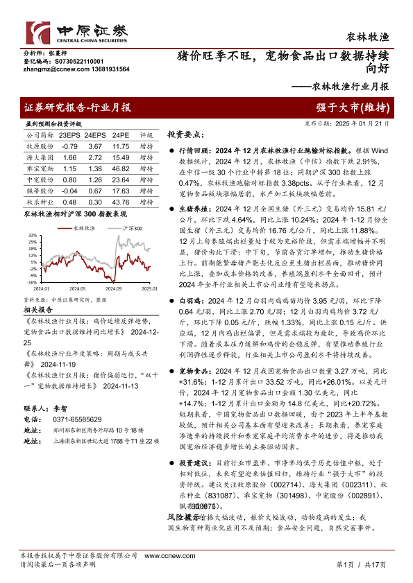 【中原证券】【20250121】20250121-中原证券-农林牧渔行业月报:猪价旺季不旺,宠物食品出口数据持续向好-17页