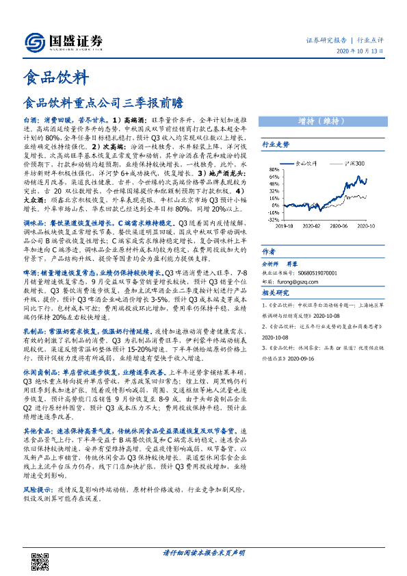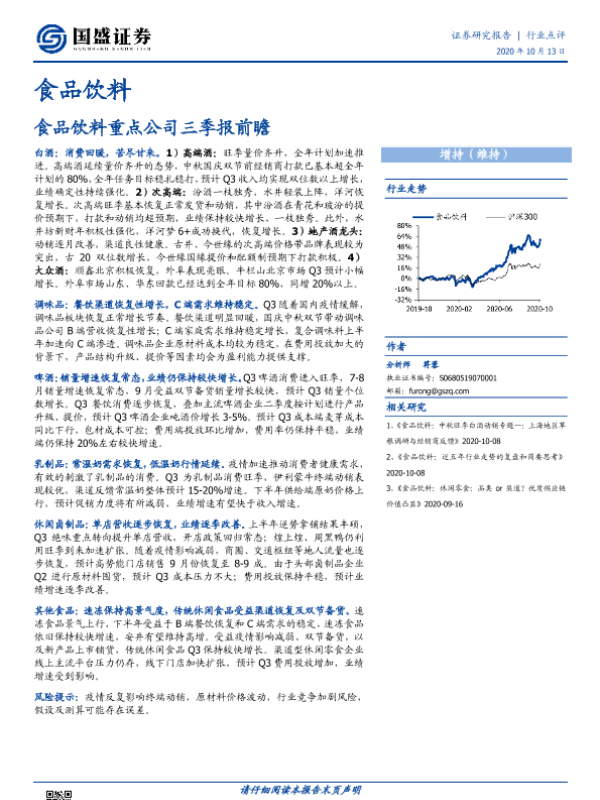 行业点评 消费品市场 食品饮料 证券研究 三季报前瞻