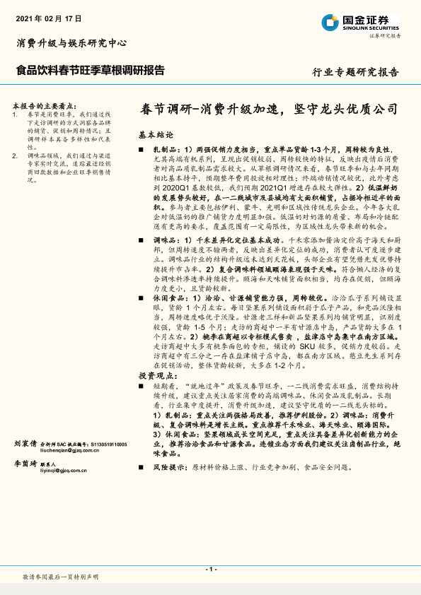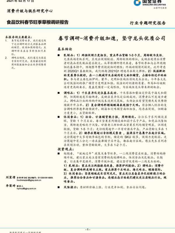 【国金证券】【20210217】食品饮料春节旺季草根调研报告:春节调研-消费升级加速,坚守龙头优质公司-11页