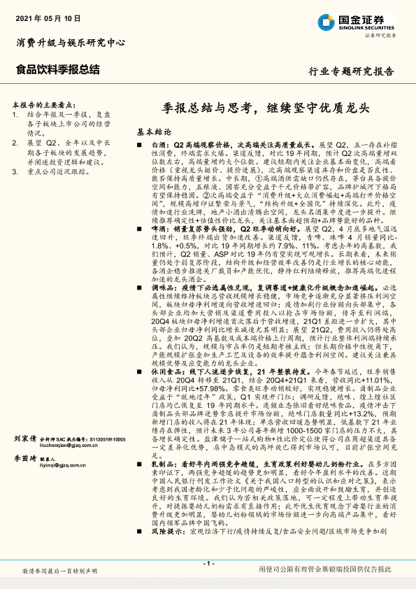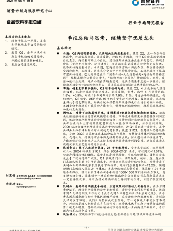 【国金证券】【20210510】20210510-国金证券-食品饮料季报总结:季报总结与思考,继续坚守优质龙头-29页