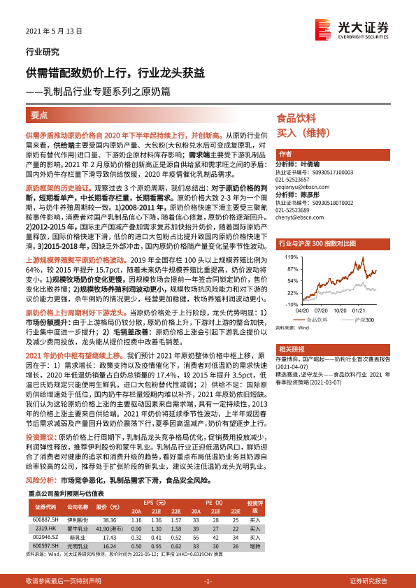 【光大证券】【20210513】乳制品行业专题系列之原奶篇:供需错配致奶价上行,行业龙头获益-27页