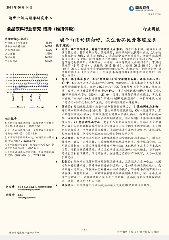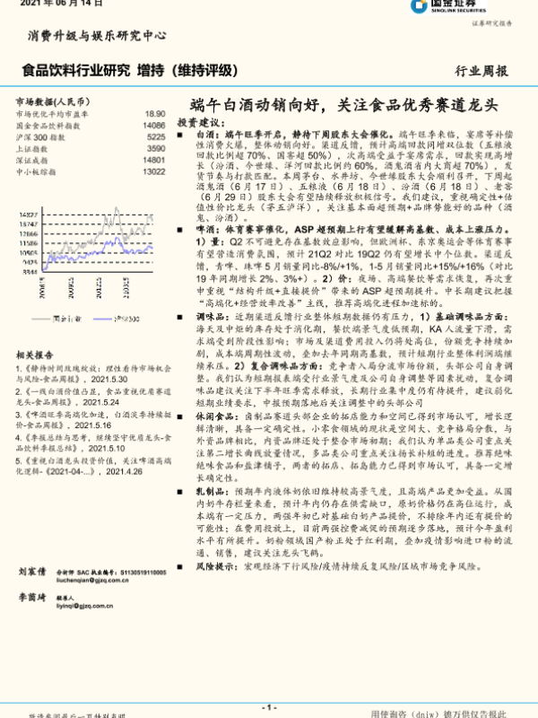 【国金证券】【20210614】20210614-国金证券-食品饮料行业周报:端午白酒动销向好,关注食品优秀赛道龙头-14页