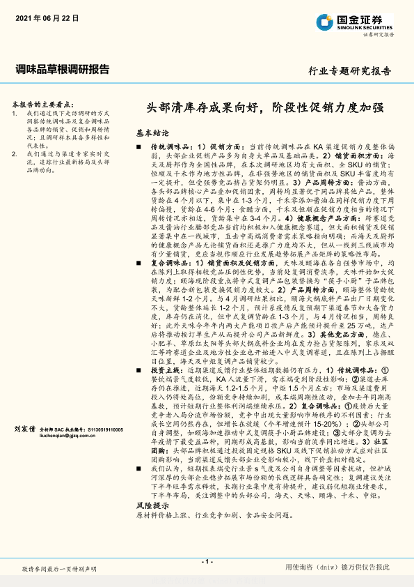 【国金证券】【20210622】20210622-国金证券-调味品草根调研报告:头部清库存成果向好,阶段性促销力度加强-21页