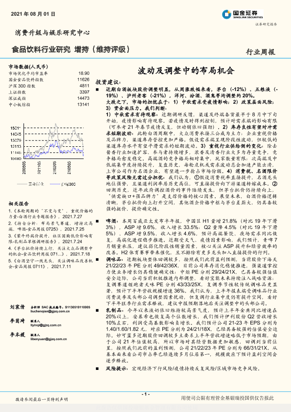【国金证券】【20210801】20210801-国金证券-食品饮料行业研究周报:波动及调整中的布局机会-14页