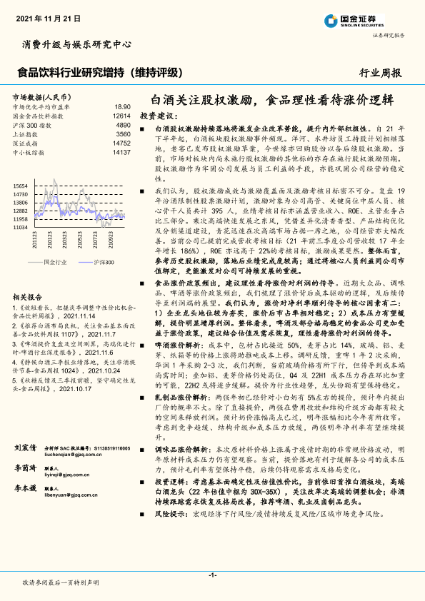 【国金证券】【20211121】20211121-国金证券-食品饮料行业研究:白酒关注股权激励,食品理性看待涨价逻辑-18页