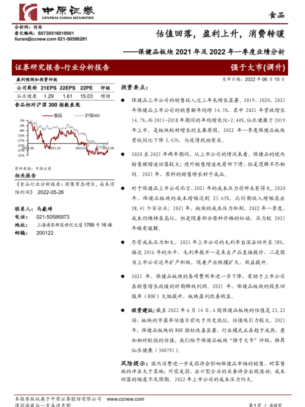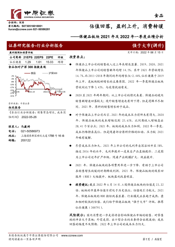 【中原证券】【20220615】保健品板块2021年及2022年一季度业绩分析:估值回落,盈利上升,消费转暖-9页