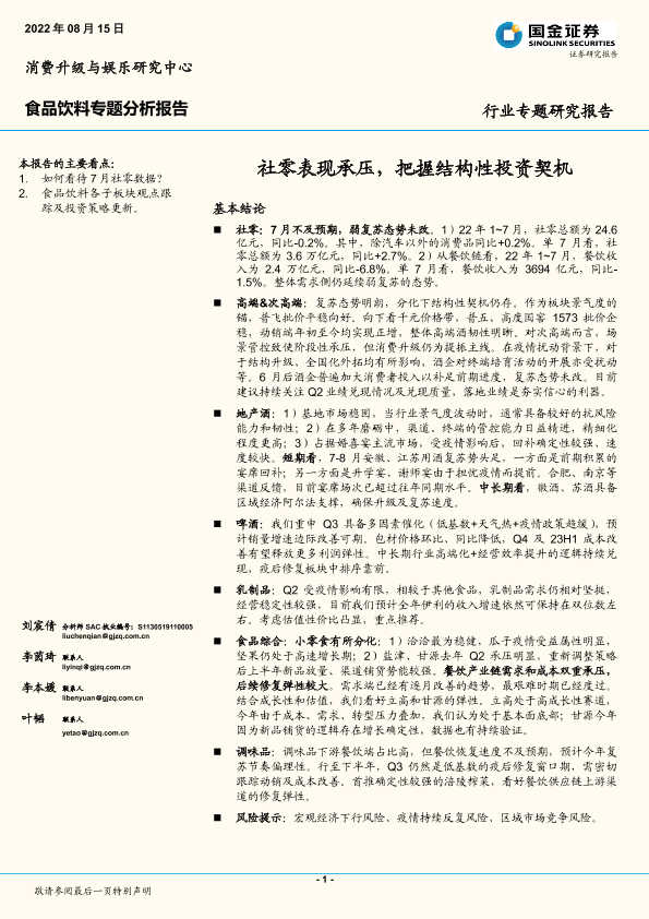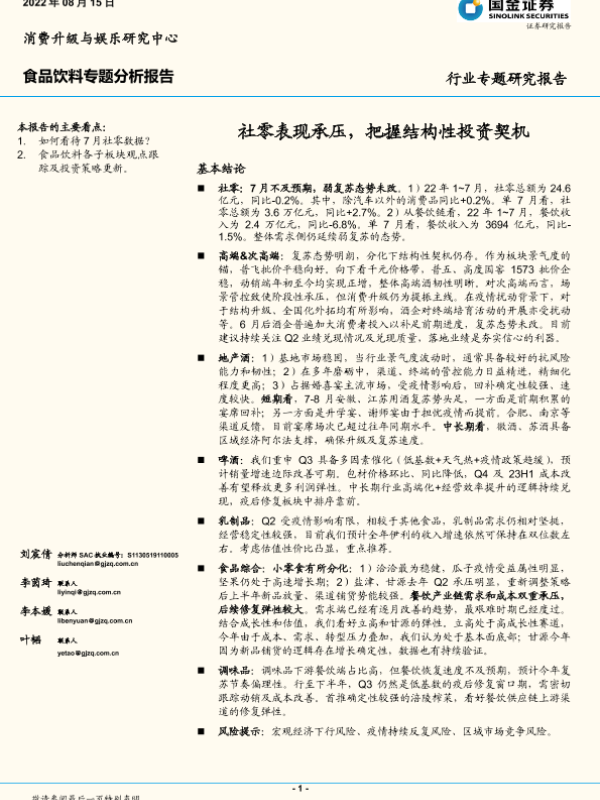 【国金证券】【20220815】20220815-国金证券-食品饮料专题分析报告:社零表现承压,把握结构性投资契机-29页
